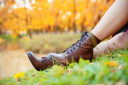 Young woman's ankles sitting in brown boots on grass with autumn leaves horizontal texture nature fall october sexy naked legs
