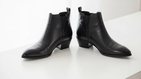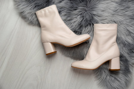 Black female boots on white background. Flat lay, top view minimal background. Fashion blog or magazine concept.