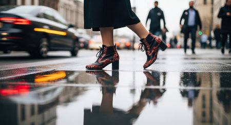 A woman wearing fashionable leopard print boots walks across a wet street, with reflections of the surroundings.
