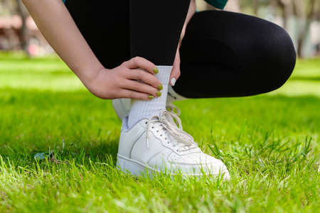 People in a sporty outfit feeling sore on foot after practice exercise in a public park outdoors. Concept of a healthy active lifestyle