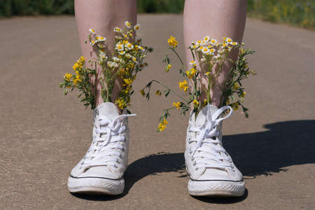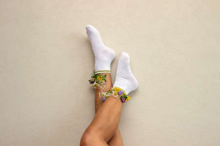 upside down view of female legs with fresh flowers in socks. A young hipster girl with flowers from white socks