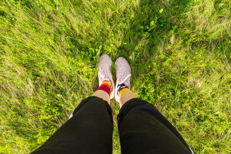Top view of the feet of a girl in red sneakers on green grass on a bright sunny day the suns rays summer fun
