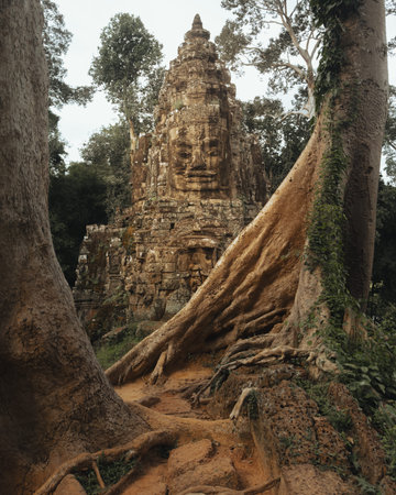 Bayon Temple Face Gate Hidden in Cambodian Jungle Roots, Angkor Wat Ruins