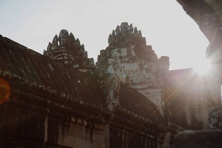 Generative AI : SIEM REAP CAMBODIA December 082019 Beautiful view of Angkor temple with sunrise and lens flare in morning Angkor Wat is a temple in Cambodia and the largest religio