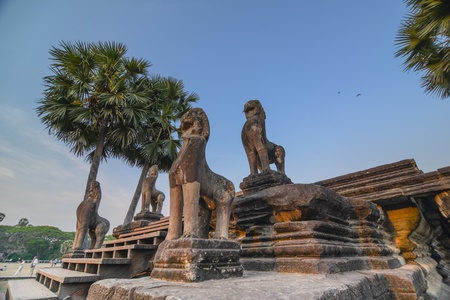 Row of sculptures in the South Gate of Angkor Thom complex. Siem Reap, Cambodia.Angkor wat in the rays of the setting sun