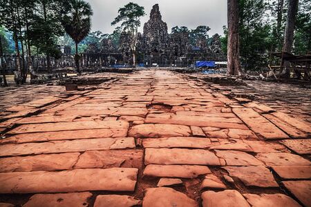 Ancient Bayon castle, Angkor Thom, Cambodia. Vintage filter.