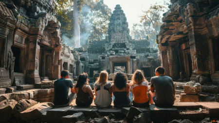 A group of friends sit on the edge of a crumbling stone wall backs to the camera admiring the intricate carvings and structures .