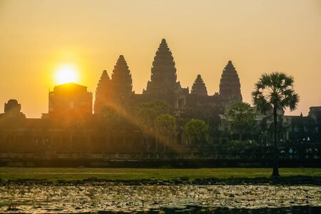 Sunrise at Angkor Wat, part of Khmer temple complex, popular among tourists ancient landmark and place of worship in Southeast Asia. Siem Reap, Cambodia.