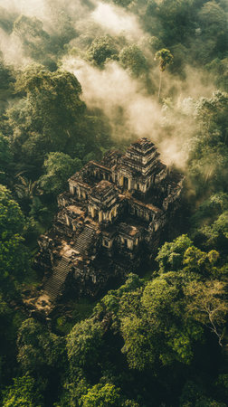 A breathtaking view of an ancient stone temple partially obscured by fog, surrounded by lush jungle foliage in Cambodia's wild terrain at dawn.