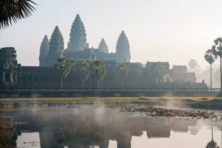 A misty morning at Angkor Wat, with the spires of the temple emerging from the fog Ai generated