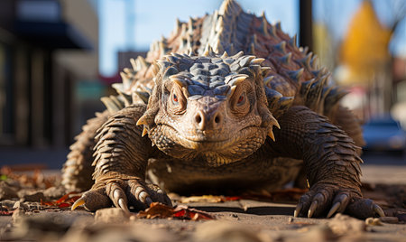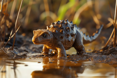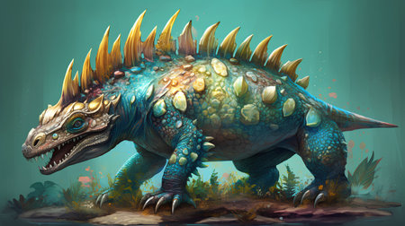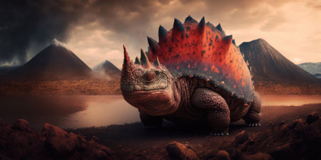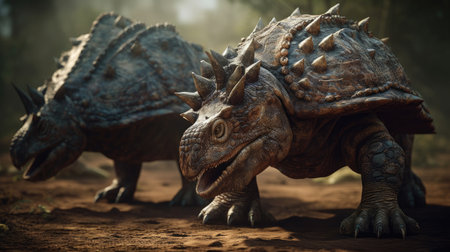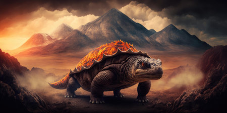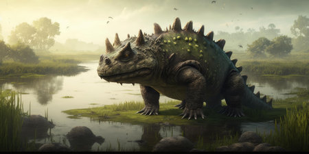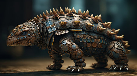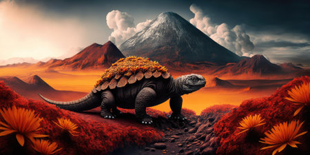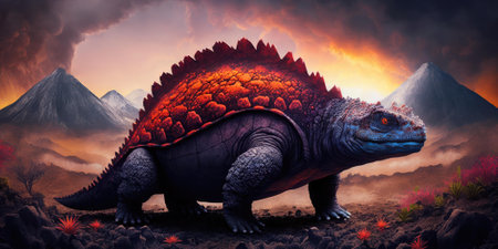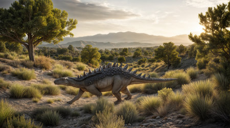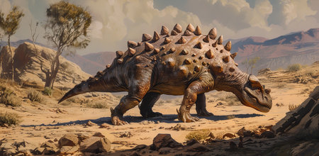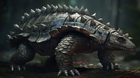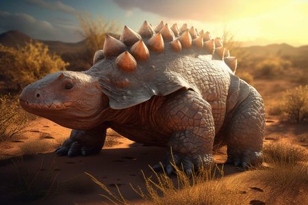 An immense ankylosaurus its armorplated body shining beneath the scorching sun lumbering across a barren savanna.. AI generation