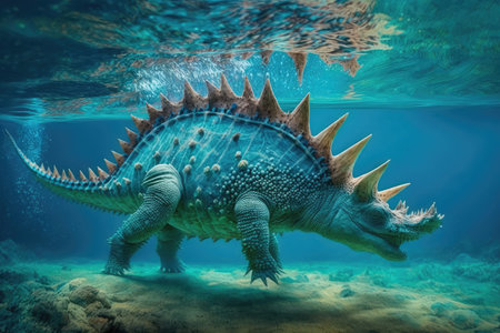 stegosaurus dinosaur swimming in clear blue water, created with generative ai