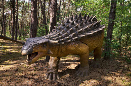 Belgorod, Russia - September 06, 2021: Ankylosaurus statue in the pine forest of Belgorod dinopark. herbivorous dinosaur.