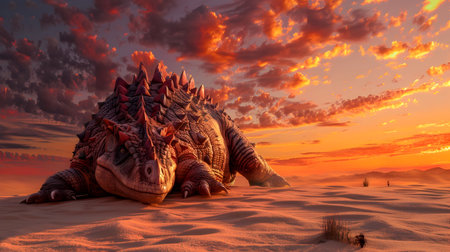A massive heavily armored ankylosaurus dinosaur rests on the warm golden sands of a coastal beach silhouetted against a breathtaking sky ablaze with fiery hues of red orange and gold as the sun dips