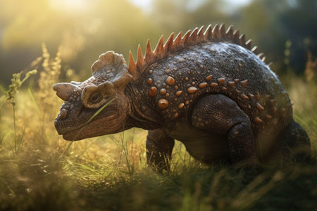 A Pachycephalosaurus grazing in a meadow its thick spiky dome shining in the afternoon light.. AI generation