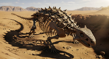 A scientifically accurate 3D rendering of a complete Ankylosaurus skeleton stands in a vast, sunlit desert. The fossil of the armored dinosaur, with its bony plates and club tail, casts a dramatic shadow on the sand, evoking concepts of paleontology and extinction.