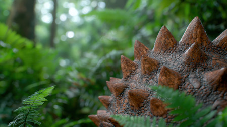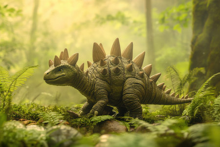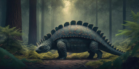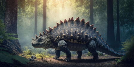 A dinosaur with a lot of spikes on its back is walking through a forest. Scene is mysterious and eerie, as the dinosaur is a creature that is not commonly seen in modern times