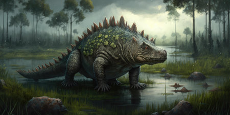 Prehistoric creature or dinosaur in the wild nature. Realistic style drawing. superlative generative AI image.