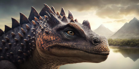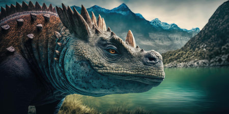 Closeup on head herbivorous dinosaur. Prehistoric reptile. Generative AI.