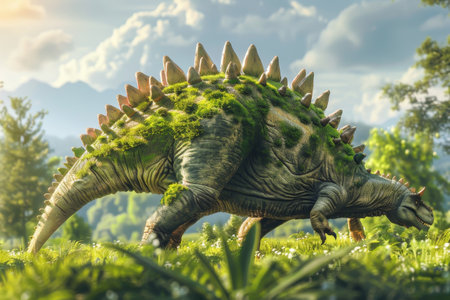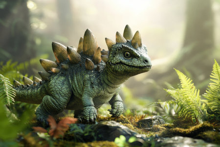 Stegosaurus roaming a lush, sunlit prehistoric forest, majestic and ancient