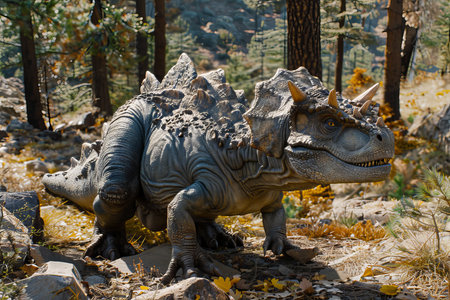 Step back in time with this realistic depiction of a dinosaur in its lush forest habitat.