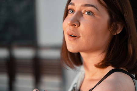 Beautiful caucasian woman in a blue shirt sits at a table in a cafe with a dreamy look