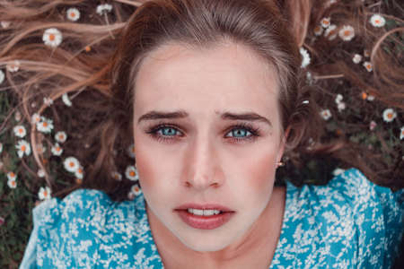 Beautiful woman portrait in daisy flower bed with blue dress an emotions