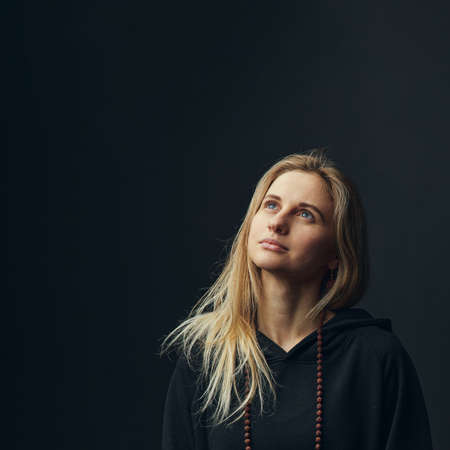 A beautiful, thoughtful girl looks up into the distance. Soft blue sky in the background