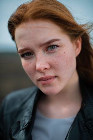 Nice girl with long red hair is standing on the background of a water surface. Portrait of a woman without retouching with her natural imperfections