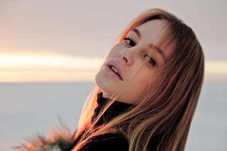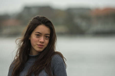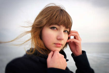Young girl, wearing casual clothes, photographed on the beach in winter.