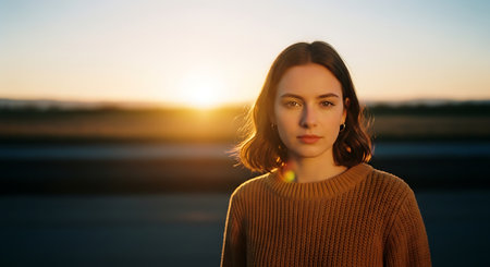 A young woman with brown hair and a brown sweater stands in front of a blurred background of a sunset, with the sun shining brightly behind her, creating a warm and serene atmosphere.