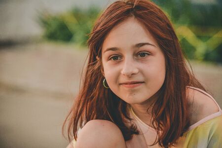 Teen girl 9 or 10 years old on the street. Girl on a walk on the street in a t-shirt. Girl with a caret and brown hair. A look to the side. holidays