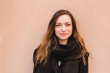 Young blonde girl in black scarf and beige coat stands and smiling stares straight at the camera. High quality photo