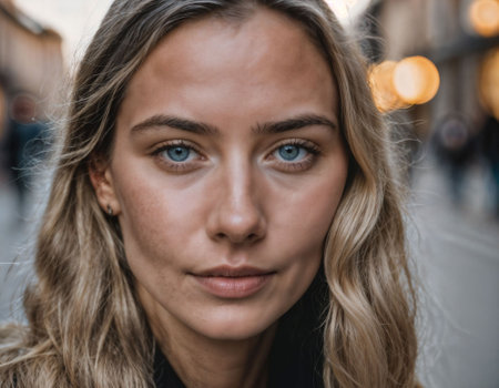 A young woman stands against a wall with her head turned. She has curly hair and looks directly at the viewer. The sky is light as evening approaches.