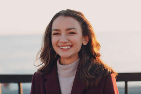 Portrait of a beautiful young girl outdoors. Outdoors portrait of beautiful young brunette woman looking at camera. Closeup sensual portrait of beautiful girl outdoors. Art photo