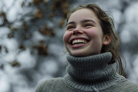 A young woman with long, dark hair and a black turtleneck smiles broadly while looking off to the side. The background is blurred, suggesting an outdoor setting with trees and foliage.