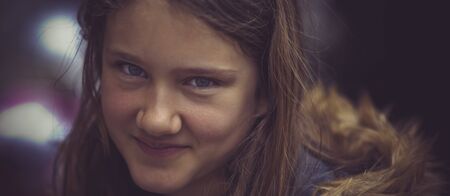 Outdoor portrait of a thoughtful teenage girl wearing khaki parka. Toned effect