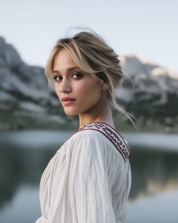 A young woman with blonde hair pulled back, wearing a white dress with embroidered trim, looks over her shoulder towards the camera. She is positioned in front of a blurred background of a lake and mountains, suggesting an outdoor, possibly scenic, setting.