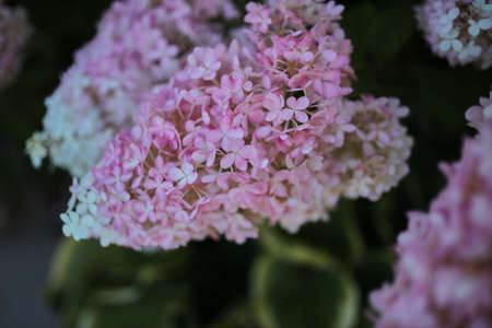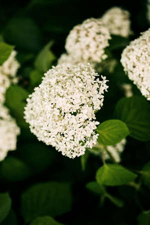 Small flowers blooming white hydrangea closeup, garden flower decorative poisonous beautiful bush. White flowers Hydrangea dogwood, background wallpaper banner