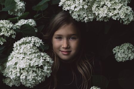 Cute little girl in blooming hydrangeas. Person and flowers on dark natural background. Child enjoying bouquet outside. Going to park, forest in summer and spring. Connection with nature idea