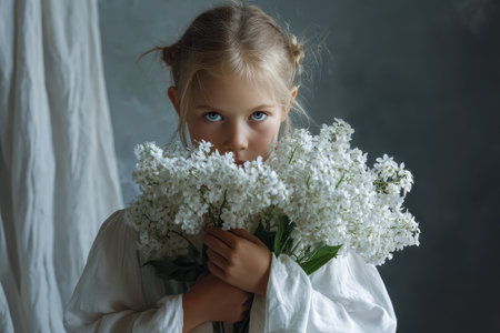 Young girl holding a large bouquet of white flowers in a softly lit indoor setting with light colored backdrop
