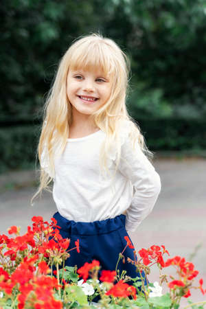 portrait of a beautiful smiling blonde girl in a white blouse near flowers