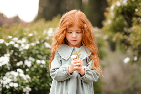 Cute baby girl 4-5 year old with long curly red hair holding flower standing in meadow with nature green blooming background. Little child wear retro rustic style dress outdoor. springtime. Childhood.