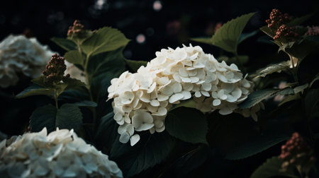 Close-up image of a beautiful white hydrangea in full bloom. The delicate petals and lush green leaves create a serene and peaceful atmosphere.