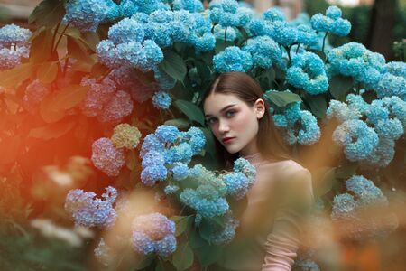 Cute little girl in blooming hydrangeas. Person and flowers on natural background with sushine. Child enjoying bouquet outside. Going to park, forest in summer and spring. Connection with nature idea