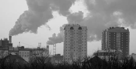 Thick white smoke from the pipes of boiler rooms and pipes of factories and factories.