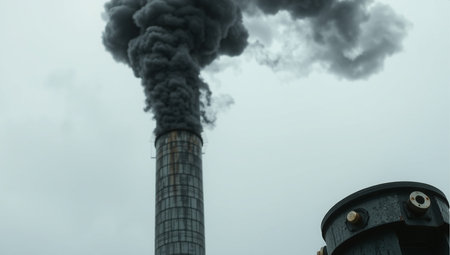Black smoke escapes from tall chimneys in an industrial complex, creating a dramatic contrast against the overcast sky.