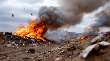 A striking image of smoke and fire billowing from a landfill site, surrounded by debris. Birds fly in the grey sky above as a city skyline looms in the distance, highlighting environmental concerns.