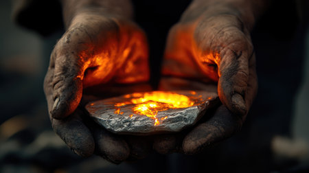 A pair of calloused hands cradles a glowing piece of slag metal, radiating intense heat in a dimly lit workshop, showcasing the beauty of craftsmanship.