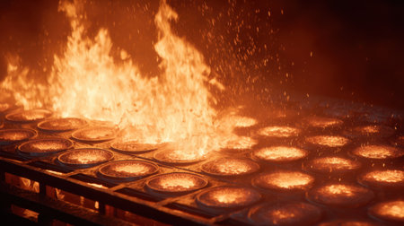 A captivating industrial scene showcasing fiery machinery amidst billowing smoke, highlighting the intense atmosphere of manufacturing and engineering processes.